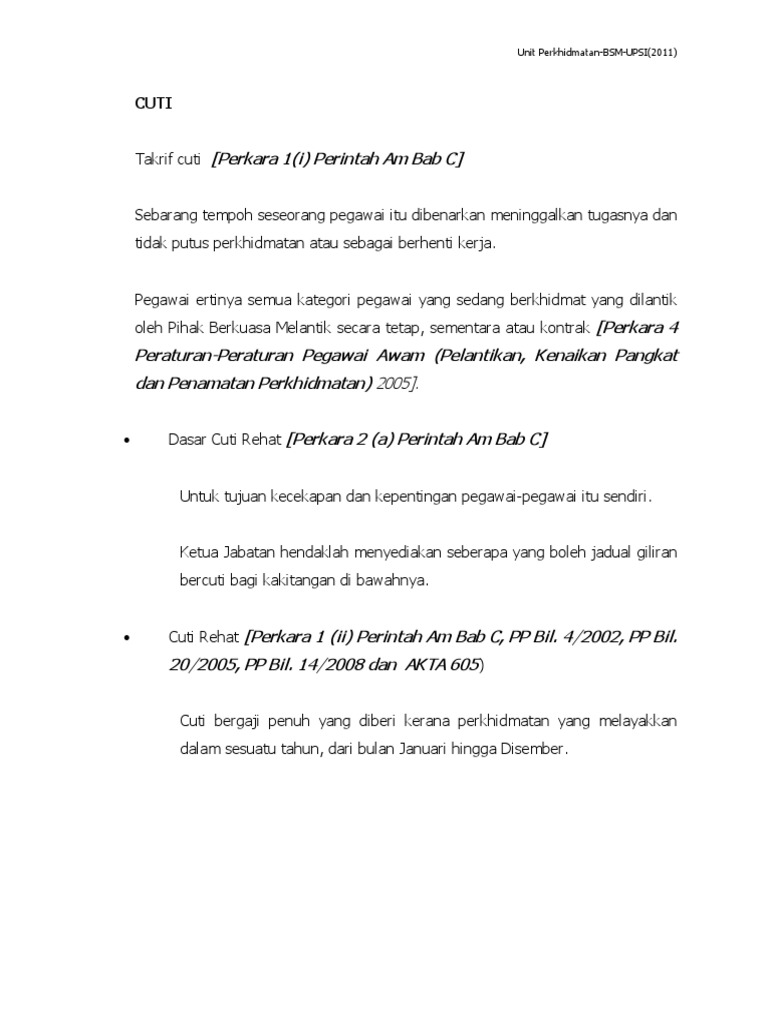 Jenis jenis cuti cuti tahunan cuti mandatori cuti lebih masa off in lieu cuti tanpa catat cuti khas menunaikan fardhu haji. Pekeliling cuti haji bagi penjawat awam. Cuti bermakna sebarang tempoh seseorang pegawai itu dibenarkan meninggalkan tugasnya dan peninggalan tugas itu tidak dikira sebagai putus perkhidmatan atau sebagai berhenti kerja.