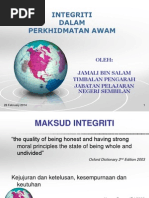 Integriti penjawat awam pula bermaksud melaksanakan amanah dan kuasa yang diberi untuk kepentingan umum dan tidak menyalahgunakan kuasa tersebut untuk kepentingan diri keluarga saudara-mara atau kaum kerabat sendiri. 27 Mei 2021 Perhimpunan Bulanan Jabatan Perkhidmatan Awam Bulan Mei 2021 Tema. Elemen-elemen integriti penjawat awam.
