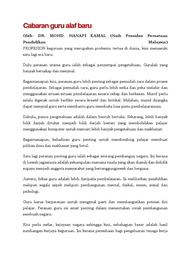 Keempat guru menjadi unsur paling penting dalam pendidikan dan kualiti pendidikan banyak. 2019-08-07 - Oleh OSMAN SAID. Bebanan guru makin besar yang menuntut kesabaran serta ketanggungjawaban yang amat hebat.